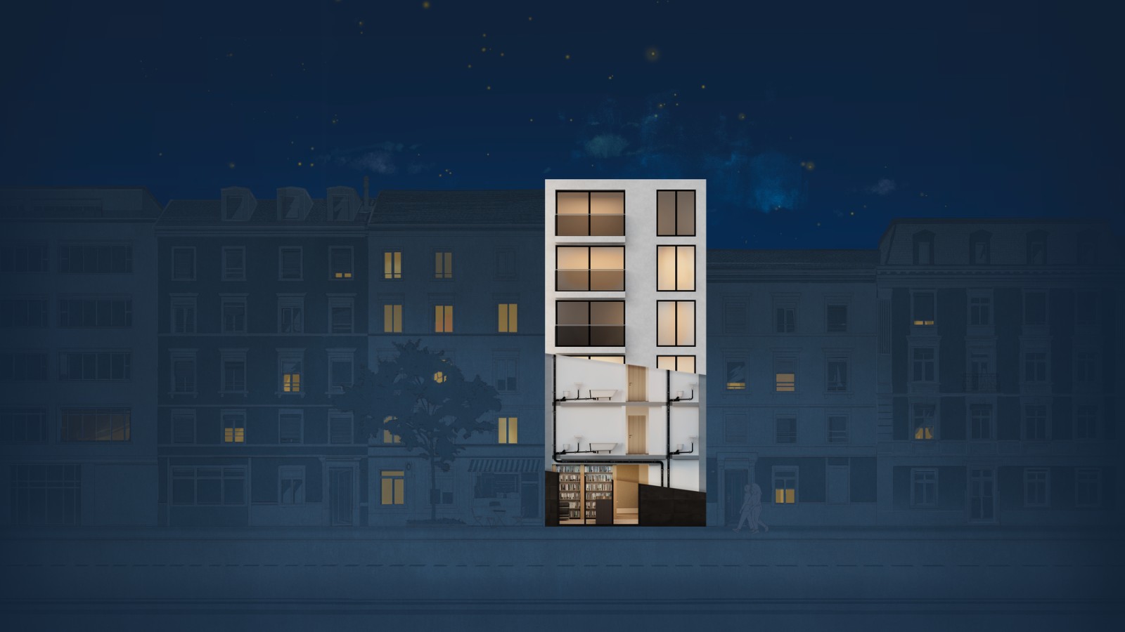 Querschnitt eines Wohnblocks mit Geberit Entwässerungssystemen